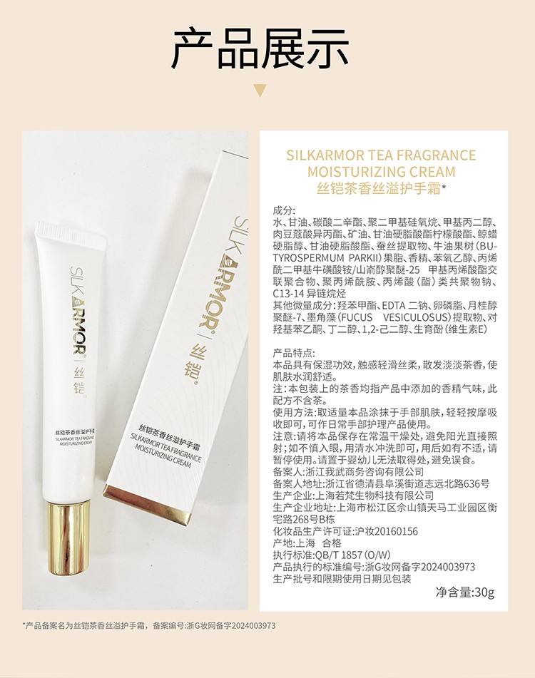 【备案编号】:浙G妆网备字2024003973 【产品特点】:本品具有保湿功效,触感轻滑丝柔,散发淡淡茶香,使肌肤水润恬静。 【使用要领】:取适量本品涂抹于手部肌肤,轻轻推拿吸收即可,可作一样平常手部照顾护士产品使用。 【适合人群】:通俗人群 【使用限期】:3年